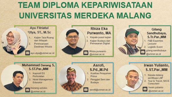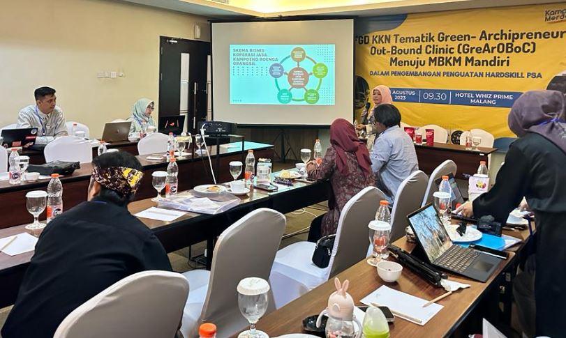 Malang, 26 Agustus 2023, Implementasi KKN Thematik Program Kompetisi Kampus Merdeka (PKKM) Program Studi Arsitektur sampai pada tahapan penetapan program Pendampingan Mitra Koperasi Jasa Kampoeng Boenga Grangsil. Penetapan program pendampingan dilakukan melalui kegiatan FGD KKN Thematik Green-Archipreneur Out-Bound Clinic (GreArOBoC) di Songgoriti Room, Whiz Prime Hotel Kota Malang, Sabtu 26 Agustus 2023. Kegiatan FGD dibuka oleh Bapak Aang Fadjar Passa P., SE., MMI., dan dihadiri Mitra Koperasi Jasa Kampoeng Boenga Grangsil, serta Mitra Kolaborasi (Program Diploma Kepariwisataan Unmer Malang. Narasumber FGD Mitra Koperasi JKBG adalah Ibu Sriwati (Founder dan Owner Rumah Kopi Grangsil) yang mewakili Koperasi JKBG, serta Ibu Ayu Fitriatul ‘Ulya., ST., MSc., Dosen D4 Destinasi Wisata yang mewakili Program Diploma Kepariwisataan (PDK). Tim kolaborator PDK terdiri dari 6 dosen; (1). Ayu Fitriatul ‘Ulya., ST., MSc; (2) Muhammad Danang S.ST.Par., MM; (3) Rhiza Eka Purwanto, MA; (4) Asrofi, S.Pd., M.Pd; (5) Gilang Sandhubaya., S.Tr.Par., MM; dam (6) Irwan Yulianto, S.ST.Par., MM, dengan bidang kontribusi sebagai berikut;