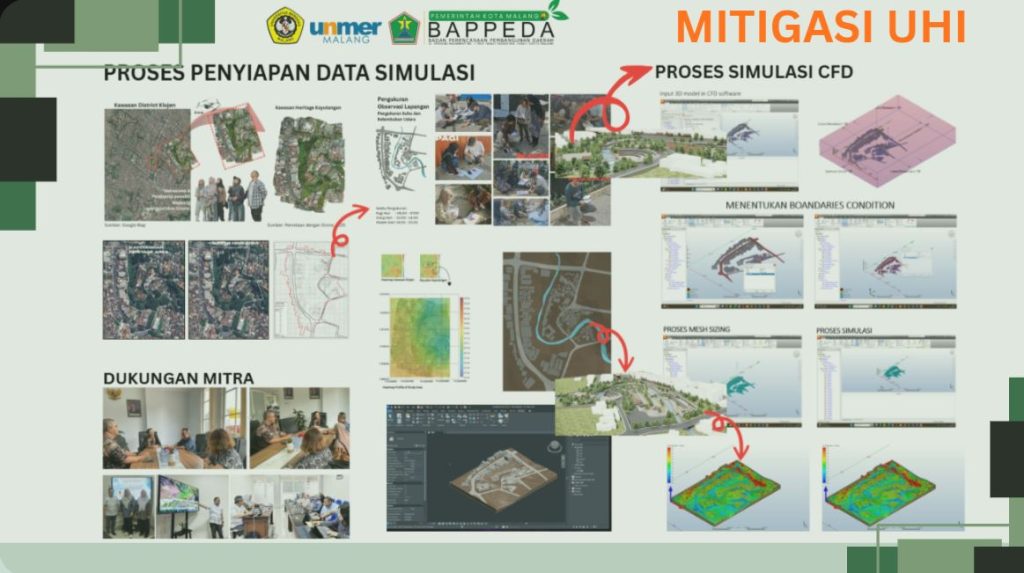 Pada hari Selasa 28 Oktober 2025, bertempat di Ruang Rapat BAPPEDA Kota Malang digelar FGD yang bertajuk; “Model Inervensi Simulasi Mitigsi Urban Heat Island (UHI) Berbasis Computational Fluid Dynamics (CFD) pada Buffer Zone Kawasan Urban Heritage”. Kegiatan ini merupakan bagian dari penelitian yang diketuai oleh Prof. Ir. Respati Wikantiyoso, MSA., Ph.D. Penelitian ini didanai oleh DRPM, KemenDitiRisTek tahun anggaran 2025. Penyelenggaraan di Ruang Rapat BAPPEDA kota Malang, merupakan wujud komitmen BAPPEDA Kota Malang sebagai Mitra Pemkot dalam Penelitian ini. Acara FGD menghadirkan Narasumber dari BAPPEDA dan Dinas Lingkungan Hidup Kota Malang. Hadir dalam acara tersebut 10 Dinas terkait, BBWS, Perum Jasa Tirta dan BPBD Kota Malang. FGD ini merupakan kegiatan FGD Pertama, yang akan disusul FGD kedua pada Awal Desember 2025, di tempat yang sama, yang akan fokus membahas hasil simulasi CFD dan potensinya sebagai upaya Mitigasi UHI di Kawasan Heritage Kayutangan.